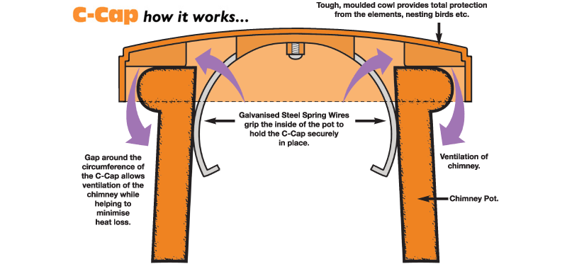 Held securely in place on the pot by galvanised steel spring wires, they take just seconds to fit and are aesthetically complimentary to the traditional appearance of the chimney.