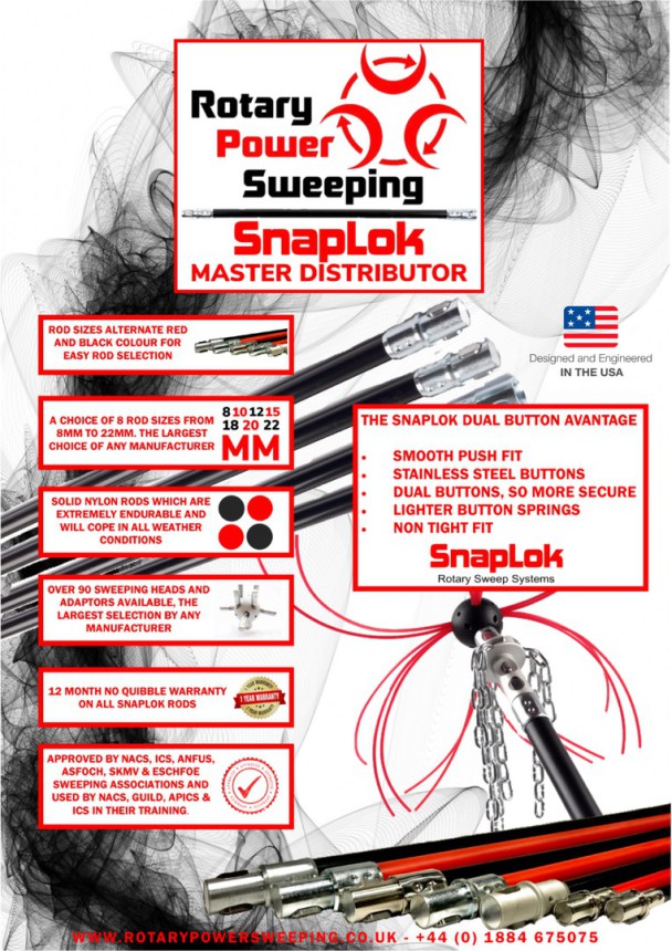 The SnapLok rotary power chimney sweep rods are available in 8mm, 10mm, 12mm, 15mm, 18mm, 20mm & 22mm, the largest selection of any manufacturer.