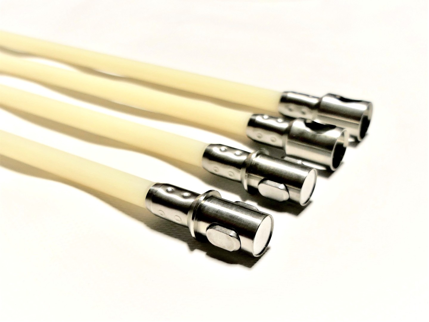 The 8mm & 10mm Solid Nylon Liner rods are quadruple crimped at each end of the fittings/ferrules, they are corrosion resistant as they are stainless steel with double buttons for double security. They are extremely flexible for tight bends and ideal for 3" to 6" flues for multifuel, oil, gas, biomass flues and duct cleaning rods.