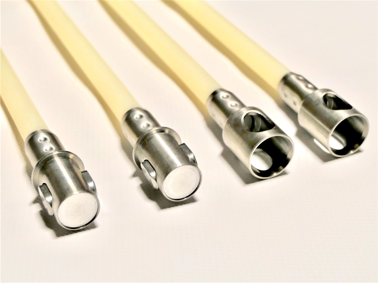 The 8mm & 10mm rods are made from extremely durable solid nylon and are quadruple crimped at each end of the fittings/ferrules, they are corrosion resistant as they are made from stainless steel, with double buttons for double security. They are extremely flexible for tight bends and ideal for 3" to 6" flues for multifuel, oil, gas, biomass flues and duct cleaning rods. These fittings are only 16mm in width and independent of the larger rods from 12mm upwards, but they can be connected to the larger rods using an adaptor(ADPT305).
